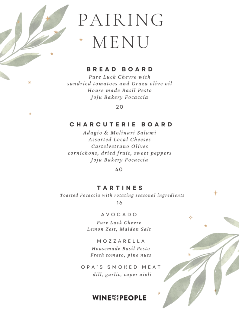 Elevate your wine tasting experience at Wine For The People with our specially curated Pairing Menu. Designed to enhance your wine indulgence, our selection marries the fine local flavors with our award-winning wines. Whether you’re joining us for a full wine tasting journey or simply sipping a glass of your favorite varietal, our Pairing Menu promises to tantalize your taste buds and enrich your visit.